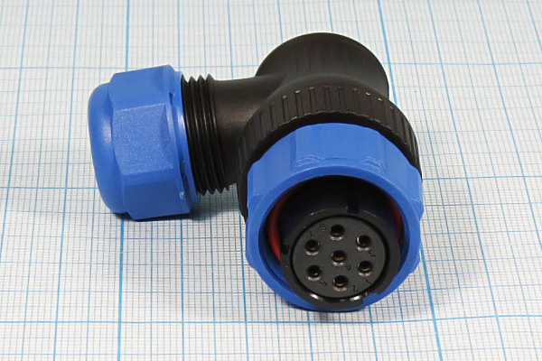 Розетка кабельная угловая SP2116/S7II1N, пластик, резьба, монтаж: пайка, контактов: 7 x 2мм, ток: 15A, напряжение: 500V, IP68, на кабель: 7-12 мм, без крышки. Ответные части - вилка межкабельная Q-10773 SP2111/P7, вилка панельная с фланцем 2 отв. Q-10906 SP2113/P7, вилка панельная с гайкой Q-10772. В магазине на Буженинова, 16: